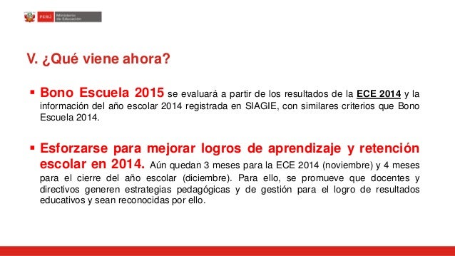 El Decreto Supremo 300-2014-EF, publicado el 30 de octubre de 2014, establece la transferencia de recursos para que las unidades ejecutoras de educación realicen el pago de Bono Escuela al personal beneficiario. Del mismo modo, se establece la publicación del listado de instituciones educativas seleccionadas, así como del personal beneficiario mediante la página web del MINEDU.