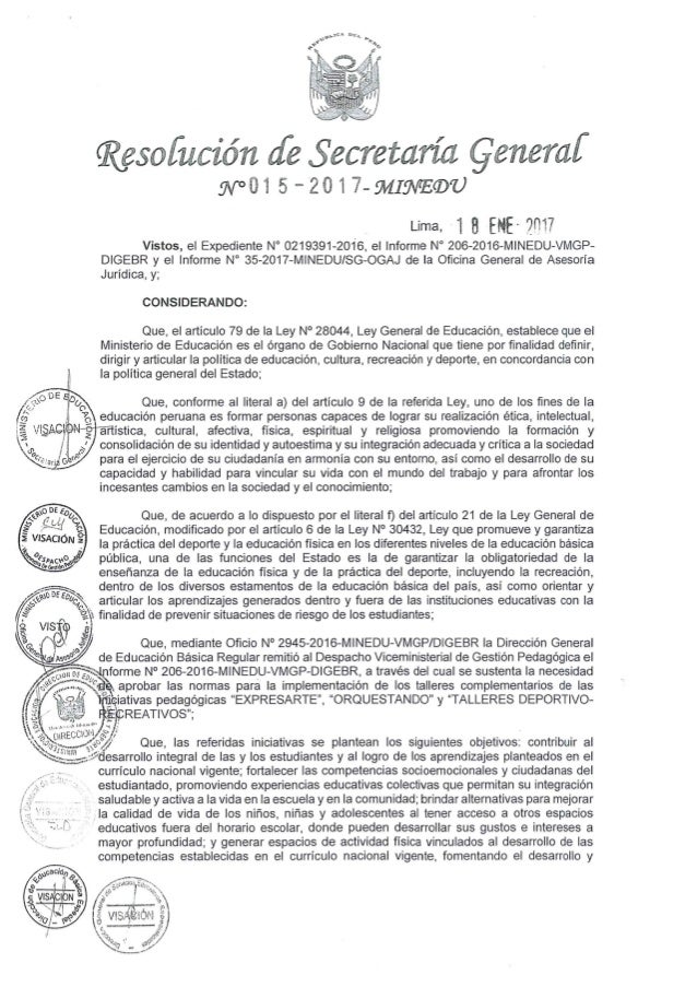 Mediante Resolución de Secretaría General N° 015-2017-MINEDU, publicado el día 20 de enero de 2017 en el Diario Oficial El Peruano, se aprueba la norma técnica denominada "Normas para la implementación de los talleres complementarios de las iniciativas pedagógicas "EXPRESARTE", "ORQUESTANDO" y "TALLERES DEPORTIVO-RECREATIVOS".