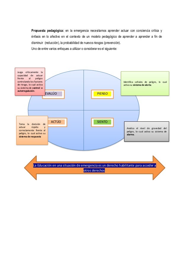 Este currículo es sencillo, pero no pierde rigor ni calidad pedagógica. Por ello responde a las necesidades y demandas de aprendizaje y reducir las consecuencias de los eventos adversos, desarrollando habilidades y destrezas (habilidades para la vida) para responder según la naturaleza de la emergencia.