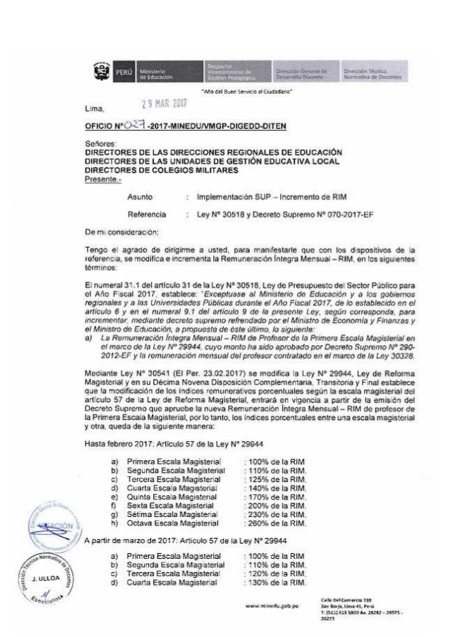 En tal sentido, la Dirección Técnico Normativa del Ministerio de Educación (MINEDU), mediante Oficio N° 027-2017-MINEDU/ establece precisiones para el incremento de la Remuneración Íntegra Mensual (RIM), en el Sistema Único de Planillas, dispuesto por el Decreto Supremo N° 070-2017-MEF, debiéndose reintegrar en el mes de marzo con Planilla Adicional y garantizándose el pago de la nueva RIM a partir del mes de abril de 2017.