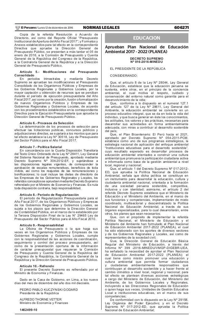 Mediante Decreto Supremo N° 016-2016-MINEDU, publicado en el Diario Oficial El Peruano el 12 de diciembre de 2016, se aprueba el Plan Nacional de Educación Ambiental 2017-2022 (PLANEA),.el cual tiene como misión promover una educación y cultura ambiental que permita formar ciudadanos y ciudadanas ambientalmente responsables que contribuyan al desarrollo sostenible y a hacer frente al cambio climático a nivel local, regional y nacional; para tal efecto se plantean diversas acciones estratégicas a cargo del Ministerio de Educación, del Ministerio del Ambiente, de los Gobiernos Locales y Regionales, incluyendo a las Direcciones Regionales de Educación o quien haga sus veces, Unidades de Gestión Educativa Local e instituciones educativas, en el marco de sus competencias.