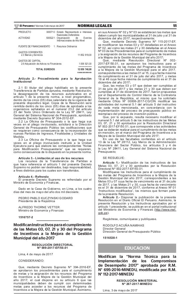 El día de hoy 05 de mayo de 2017, en el Diario Oficial El Peruano, se ha publicado la Resolución Ministerial N° 0267-2017-MINEDU_ Modifican la “Norma Técnica para la Implementación de los Compromisos de Desempeño 2017” aprobada por R.M. N° 695-2016-MINEDU, modificada por R.M.N° 112-2017-MINEDU